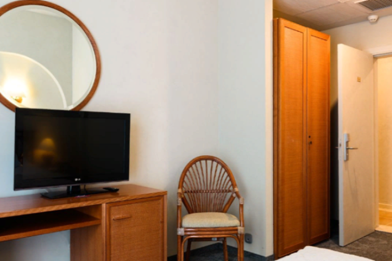 Оснащение 2-спальная кровать, прикров. тумбы, шкаф, стул, журнальный столик, стол, TВ, телефон, сейф, мини-бар, фен, ванная с душ. кабиной, чайный набор, красивый вид на парк