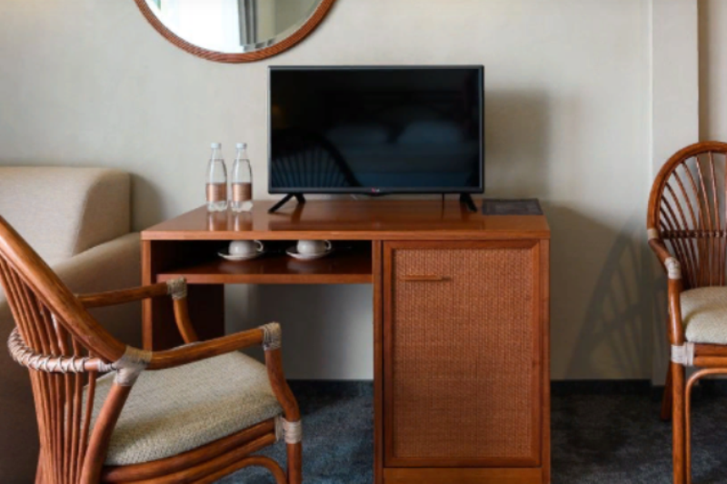 Оснащение 1 двуспальная/2 раздельные кровати, кресло, прикров. тумбы, шкаф, стул, журнальный столик, стол, TВ, телефон, сейф, мини-бар, фен, холодильник, ванная с душем, чайный набор