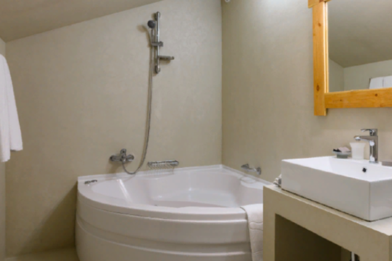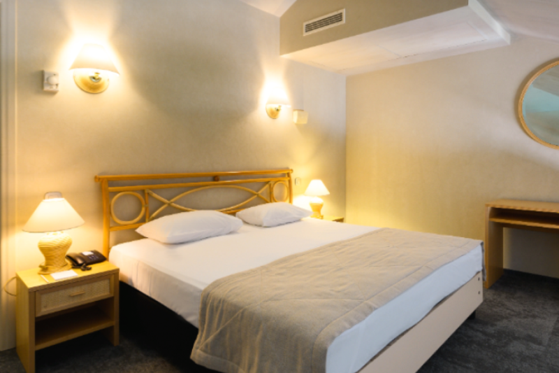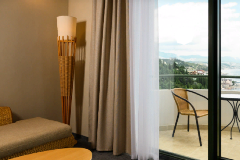 Оснащение 1 двуспальная/2 раздельные кровати, прикров. тумбы, балкон, шкаф, стул, журнальный столик, стол, TВ, телефон, сейф, мини-бар, фен, 2-е ванных комнаты, чайный набор, красивый вид на море