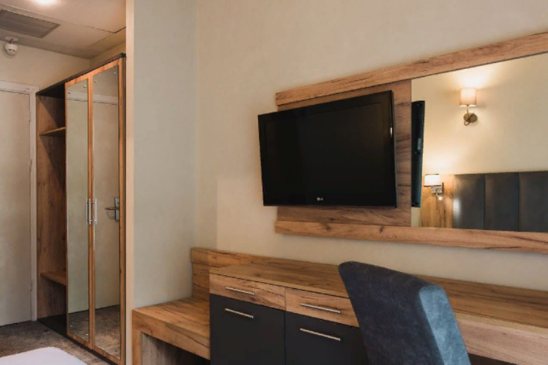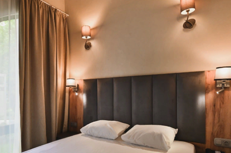 Оснащение 2-спальная кровать, прикров. тумбы, шкаф, стул, журнальный столик, стол, TВ, телефон, сейф, мини-бар, фен, холодильник, ванная с душем, чайный набор, красивый вид на горы