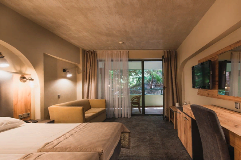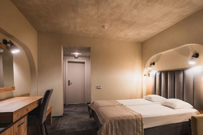 Оснащение 2-спальная кровать, спальня, гостиная, диван, большой балкон, 2 этажа, мраморная лестница, шкаф, стул, журнал. столик, стол, TВ, телефон, сейф, муз. центр, мини-бар, сушилка д/белья, фен, ванна-джакузи