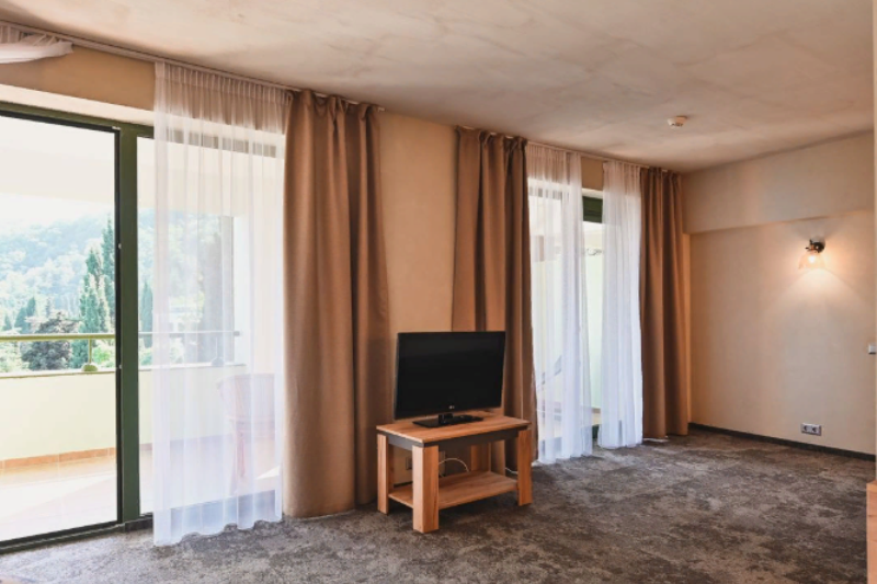 Оснащение 2-спальная кровать, гостиная, спальня, диван, 2 балкона, прикров. тумбы, шкаф, стул, стол, TВ, телефон, сейф, мини-бар, сушилка для белья, фен, ванная, косметич. принадлежности, панорамный вид на море