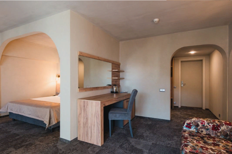 Оснащение 2-спальная кровать, диван, балкон, прикров. тумбы, шкаф, стул, журнальный столик, стол, TВ, телефон, сейф, муз. центр, мини-бар, сушилка для белья, фен, ванна-джакузи, косметич. принадлежности, чайный набор