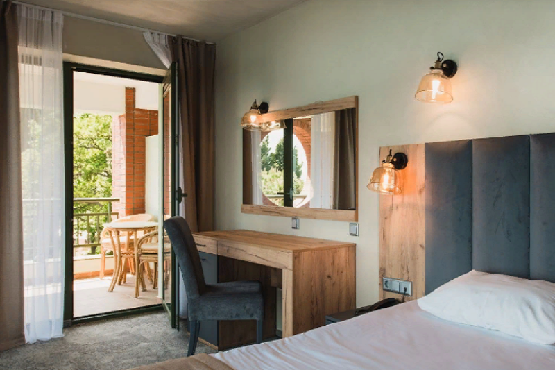 Оснащение 1 двуспальная/2 раздельные кровати, француз. балкон, прикров. тумбы, шкаф, стул, стол, TВ, телефон, сейф, мини-бар, фен, ванная с душем, чайный набор, красивый вид на горы
