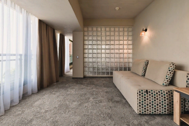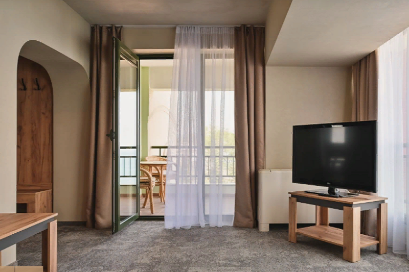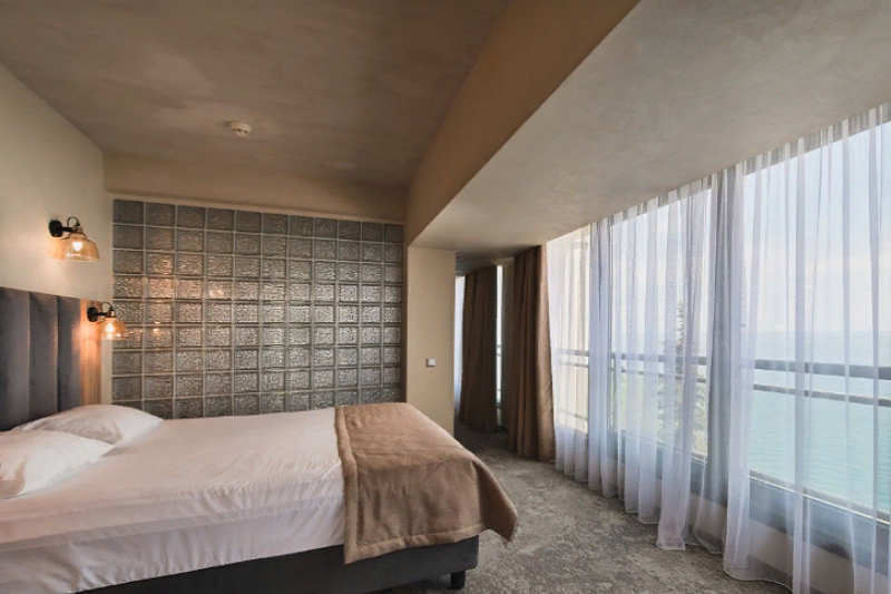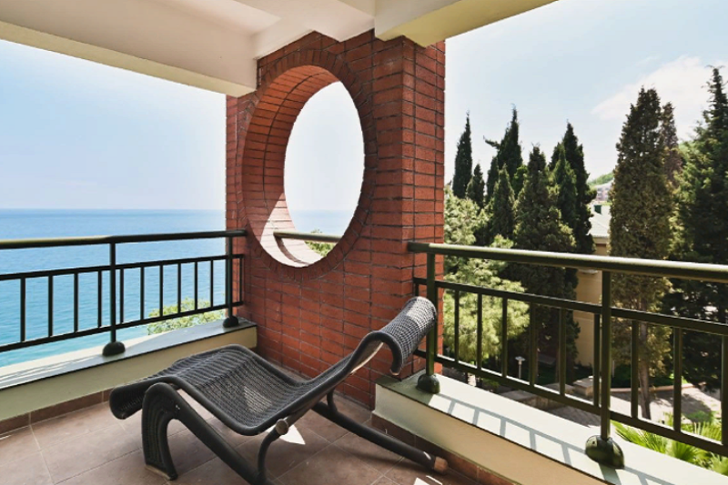 Оснащение 2-спальная кровать, терраса, француз. балкон, диван, прикров. тумбы, шкаф, стул, журнальный столик, стол, TВ, DVD-плеер, телефон, сейф, мини-бар, фен, ванная, чайный набор, красивый вид на море