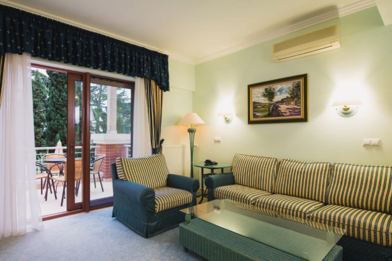Оснащение 2-спальная кровать, гостиная, спальня, диван, 2 балкона, прикров. тумбы, шкаф, стул, стол, TВ, телефон, сейф, мини-бар, сушилка для белья, фен, ванная, косметич. принадлежности, панорамный вид на море