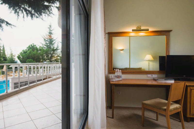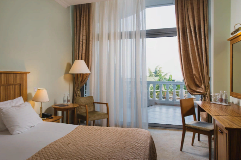 Оснащение 2-спальная кровать, француз. балкон, прикров. тумбы, шкаф, стул, стол, TВ, телефон, сейф, мини-бар, фен, ванная с душ.кабиной, чайный набор, балкон, красивый вид на парк