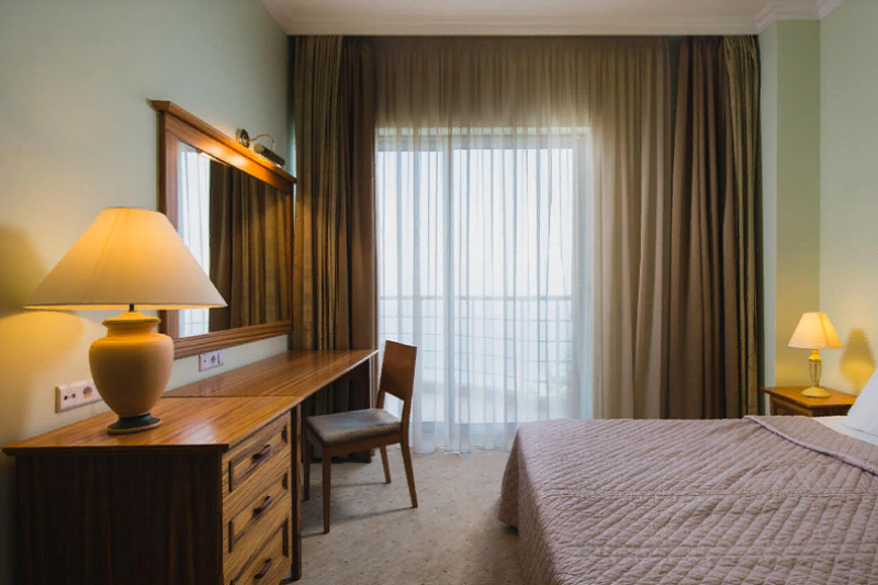 Оснащение 2-спальная кровать, француз. балкон, прикров. тумбы, шкаф, стул, стол, TВ, телефон, сейф, мини-бар, фен, ванная с душ.кабиной, чайный набор, балкон, красивый вид на парк