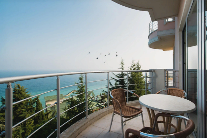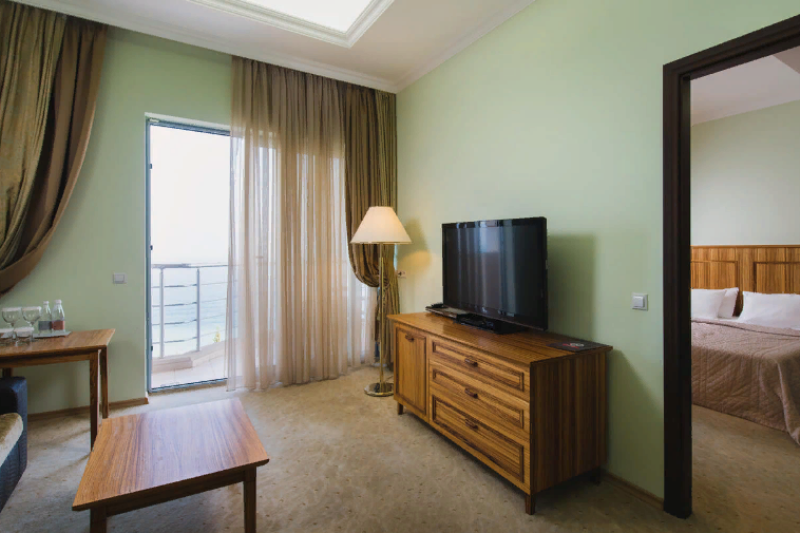 Оснащение 1 двуспальная/2 раздельные кровати, француз. балкон, прикров. тумбы, шкаф, стул, стол, TВ, телефон, сейф, мини-бар, фен, ванная с душем, чайный набор, красивый вид на горы