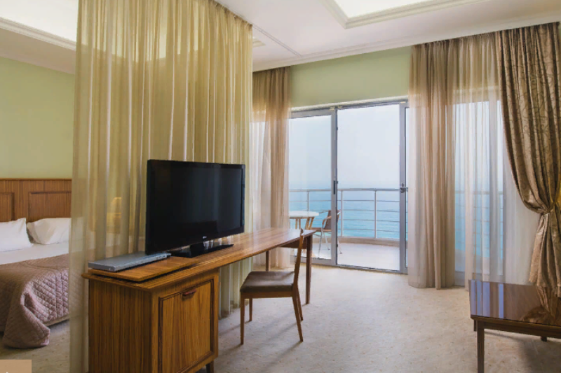 Оснащение 1 двуспальная/2 раздельные кровати, француз. балкон, прикров. тумбы, шкаф, стул, журнальный столик, стол, TВ, телефон, сейф, мини-бар, фен, ванная с душем, чайный набор, красивый вид на море