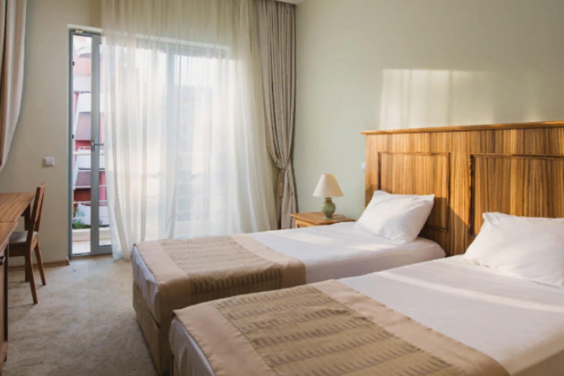 Оснащение 2-спальная кровать, прикров. тумбы, шкаф, стул, журнальный столик, стол, TВ, телефон, сейф, мини-бар, фен, холодильник, ванная с душем, чайный набор, красивый вид на горы