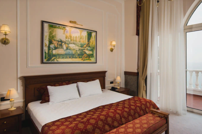 Оснащение 1 двуспальная/2 раздельные кровати, француз. балкон, прикров. тумбы, шкаф, стул, стол, TВ, телефон, сейф, мини-бар, фен, ванная с душем, чайный набор, красивый вид на горы