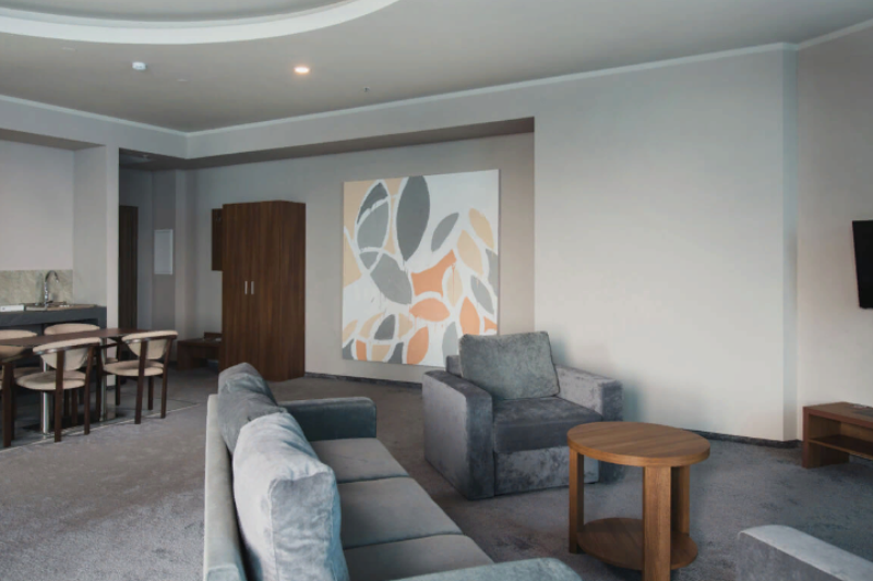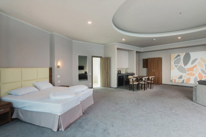 Оснащение 2-спальная кровать, спальня, гостиная, диван, 2 балкона, шкаф, стул, журнальный столик, стол, TВ, телефон, сейф, муз. центр, мини-бар, сушилка д/белья, фен, ванная, косметич. принадлежности, чайный набор